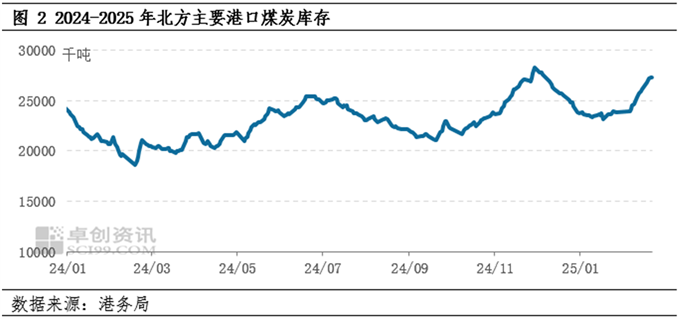 市场供应充裕,同时社会库存也整体保持在高位水平,尤其春节后北方港口煤炭库存持续快速上升。虽受发运倒挂、出货难度较大等因素影响,部分港口贸易商发运操作积极性有所下滑,但伴随产地多数煤矿恢复正常生产,煤矿直发港口资源有所增加,煤炭集港量仍保持在高位水平,港口累库进程持续。截至2月21日秦皇岛港、曹妃甸四港及京唐港合计煤炭库存达到2730.5万吨,较1月27日增加347万吨,增幅在14.56%;较去年同期增加727.7万吨,增幅在36.33%;较2024年以来库存最高点仅低3.53%。整体来看,港口库存高位加重下游用户观望情绪,且疏港风险增加,也进一步加重煤价下行压力。