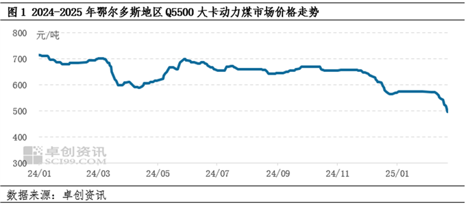 春节假期结束后国内动力煤整体以持续下行为主,现已跌至近四年最低水平。以鄂尔多斯地区Q5500大卡动力煤为例,截至2月21日市场主流价格在490-500元/吨,较春节假期前(1月27日)累计下跌77.5元/吨,降幅在13.54&;较去年底累计下跌72.5元/吨,降幅在12.78%;较去年同期下跌197.5元/吨,降幅在28.52%。