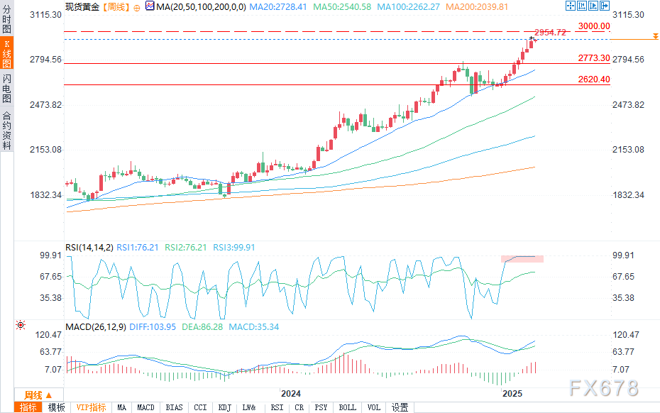 截至上周五收盘,黄金已连续八周上涨。这是自2020年高点以来的最佳涨势,2020年的那次涨势曾连续九周上涨,表现令人瞩目。但是,这或许意味着黄金的涨势正在失去动力,但它距离3000美元这一里程碑价位如此之近,以至于说,在回调之前肯定会测试一下3000美元。