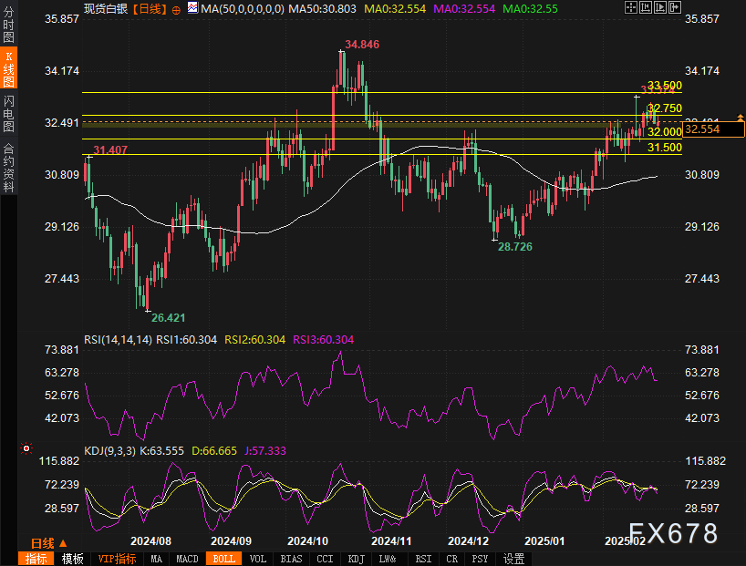 从技术面来看,白银价格目前表现出较强的支撑位,尤其是在32.00美元附近。短期内,白银可能继续在32.00-33.00美元区间内震荡整理。考虑到美元的疲软,白银价格可能会在短期内继续寻求上行突破。若白银能够突破32.75美元的技术阻力,进一步上行至33.50美元的可能性较大。