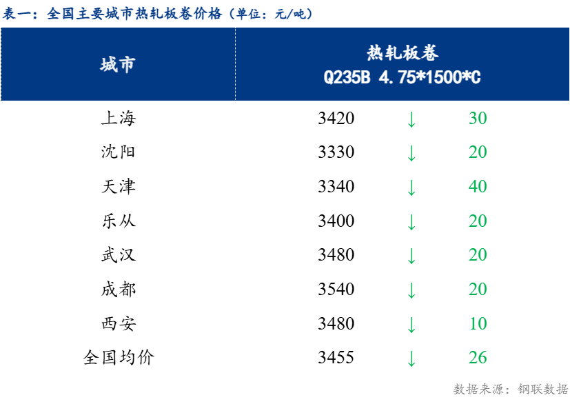 截止发稿时4.75热轧板卷全国均价3455元/吨,较上一交易日下跌26元/吨。其中主要城市价格为上海3420元/吨,沈阳3330元/吨,天津3340元/吨,乐从3400元/吨,武汉3480元/吨,成都3540元/吨,西安3480元/吨。