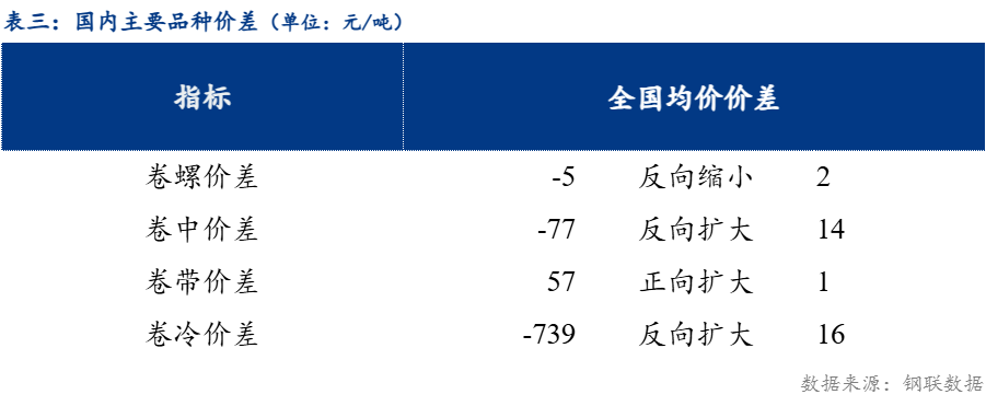 从品种价差来看,卷螺差较上一交易日反向缩小2元/吨,热中价差较上一交易日反向扩大14元/吨,热带价差较上一交易日正向扩大1元/吨,热冷价差较上一交易日反向扩大16元/吨 。