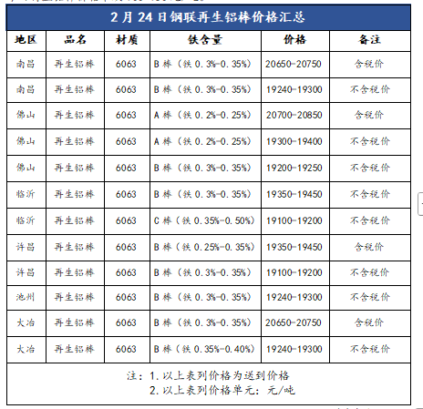 2月24日A00铝锭现货价华东20590,跌230;华南20580,跌230;中原20440,跌240(单位:元/吨)。下游逢低按需补货,棒厂积极调价出货为主,今日再生铝棒价格下跌100-150元/吨。