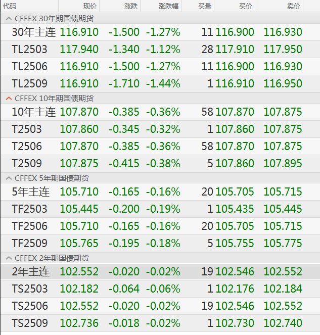 长端利率债的收益率快速上行,而短端利率债的收益率走势相对平稳。在此背景下,30年期国债期货、10年期国债期货等大跌,而2年期国债期货则微幅下跌。截至收盘,30年期国债期货跌1.27%,10年期国债期货跌0.36%,5年期国债期货跌0.16%,而2年期国债期货的跌幅为0.02%。