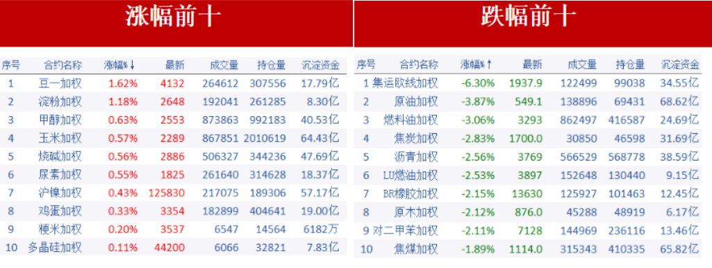 午盘收盘,国内期货主力合约跌多涨少。豆一、淀粉涨超1%,尿素、甲醇涨近1%。跌幅方面,集运指数(欧线)跌超9%,SC原油、燃料油跌超3%,焦炭、沥青、低硫燃料油(LU)、原木、丁二烯橡胶、PX0>对二甲苯(PX)跌超2%。