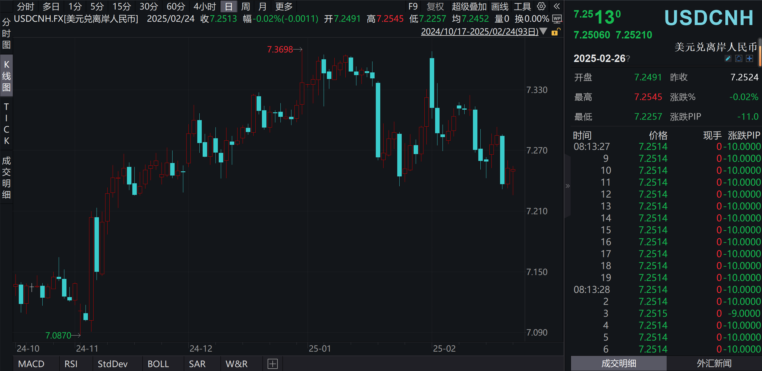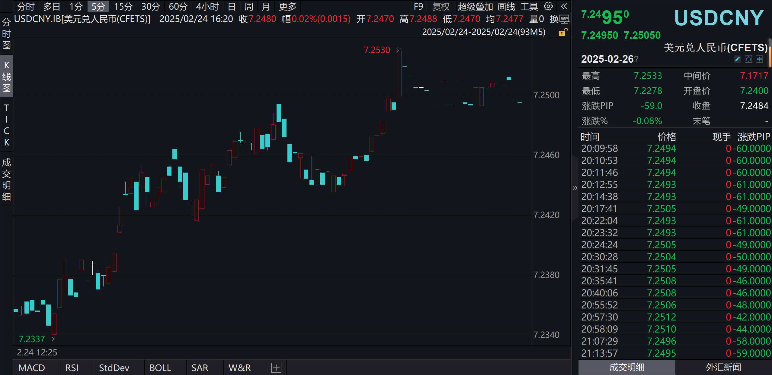 截至2月24日19时,境内在岸市场美元兑人民币汇率(CNY)与境外离岸市场美元兑人民币汇率(CNH)分别徘徊在7.2502与7.2498附近,盘中分别触及日内新高7.2278与7.2252。
