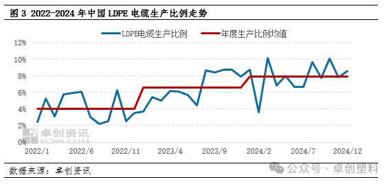 从2022年-2024年中国LDPE生产比例走势图看到,2022年-2024年LDPE电缆生产比例均值在4%-8%,占比逐年提升。2022年LDPE电缆生产比例均值在4.07%,石化企业于4-6月及10月集中生产,如茂名石化、上海石化、神华榆林、扬子巴斯夫等;2023年LDPE电缆生产比例均值在6.59%,月均产量增至1.8万吨,集中生产于8-12月,如上海石化、齐鲁石化、兰州石化。2024年LDPE电缆生产比例均值在7.91%,月均产量已超过2.2万吨,同样集中于下半年生产,如神华榆林、齐鲁石化、茂名石化、浙江石化等。
