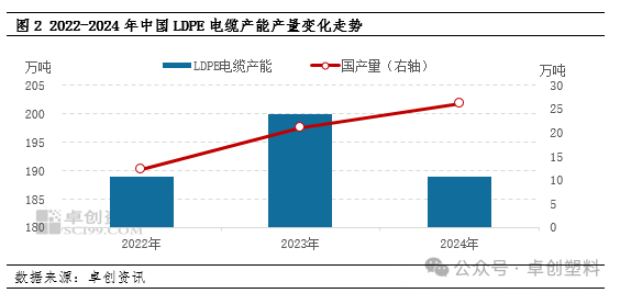 2024年中国LDPE电缆国产量增至26.24万吨,较2023年增幅在116.14%。LDPE电缆料在高压电缆中主要用于绝缘材料,经过改性后交联聚乙烯(XLPE)因其优异的耐热性、机械强度和电气性能,成为高压电缆(如中高压、超高压)的主要材料。2022-2024年中国LDPE产能在189万吨-200万吨之间波动。2023年产能增加因当年茂名石化11万吨老LDPE装置切换生产2260H,致使本年电缆产能增加,但近三年来看,国内LDPE电缆产能稳定,国产量的逐步增加无疑是内部需求的提高导致装置生产比例的提升。