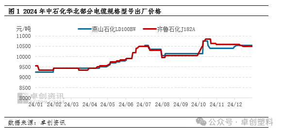 2024年中石化华北燕山石化LD100BW与齐鲁石化J182A出厂价格走势呈高相关性,且出厂价格调价频率较低,2024全年在9350-10850元/吨内波动,整体价格呈上涨趋势。LDPE电缆基料销售方式多采取直销方式,即直供改性工厂,市场流通量较少,进口货源如日本的J201、韩国的LC100同样采取直销方式,出厂价格相较于重包、薄膜类高压类别波幅较小。