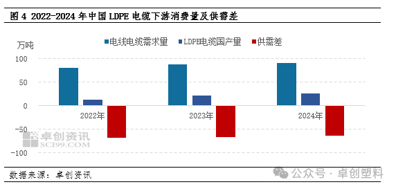 2022-2024年中国LDPE电缆需求量由80.71万吨增至90.06万吨,增幅在11.59%,虽国内供应量稳步增长,但高压、超高压电力电缆基料国产量使用量较少,约70%供应量仍依赖进口产品。