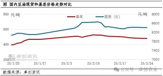 受到南美产区降雨及国内油厂开工符合逐步提高的影响,近几日国内豆油现货基差窄幅下跌,现货跟随盘面窄幅波动。2月24日国内市场又因印度方面消息影响,盘面低开窄幅震荡,多数市场现货基差也因需求不佳而有松动,整体导致价格小跌。截至2月24日收盘,全国一级豆油现货均价8410元/吨,较上一交易日跌11元/吨,跌幅0.13%;平均基差报价Y2505+480元/吨,较上一交易日跌1.25元/吨,跌幅0.26%。