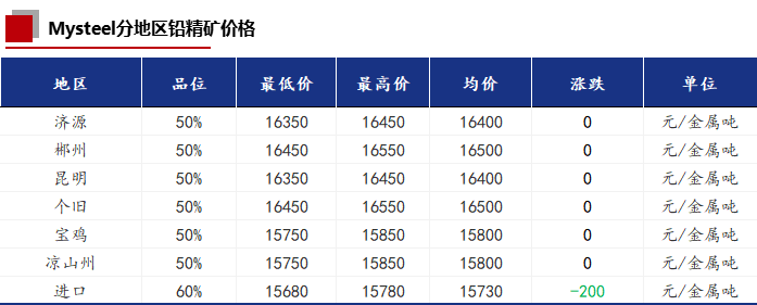 今日受铅锭价格影响,铅精矿价格较上一交易日持平元/金属吨。铅精矿加工费各地区均未调整,较上一交易日持平。进口铅精矿价格较上一交易日跌200元/金属吨。