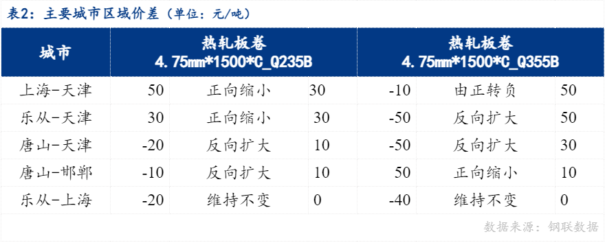从区域价差来看,4.75mm普卷华南与华北价差30元/吨,华东与华北价差50元/吨,华南与华东价差-20元/吨。京津冀地区价差来看,唐山与天津价差-20元/吨,唐山与邯郸价差-10元/吨。
