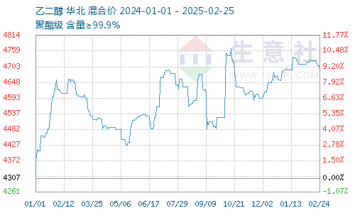 2025年2月乙二醇价格先涨后跌。据生意社数据显示,截止2月25日,国内油制乙二醇均价为4695元/吨,较2月1日乙二醇均价4711.67元/吨,下跌0.35%。