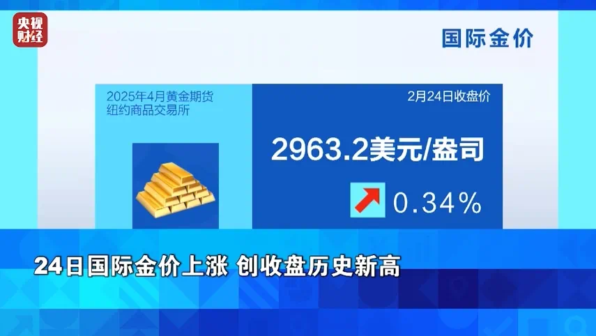 2024年以来,国际金价一路“狂飙”。而进入2025年,黄金价格亦延续了这一极为强劲的涨势。2月24日,国际金价再度创下收盘历史新高。当日,纽约商品交易所黄金期货市场交投最活跃的2025年4月黄金期价显著上涨,收于2963.2美元/盎司,涨幅达0.34%。