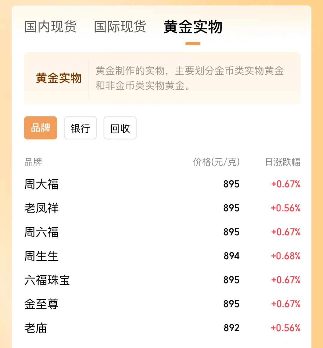 国内市场应声上涨。今天,多个黄金品牌的足金饰品价格上调,其中,周大福、周大生、潮宏基等品牌的足金饰品零售价格为895元/克。