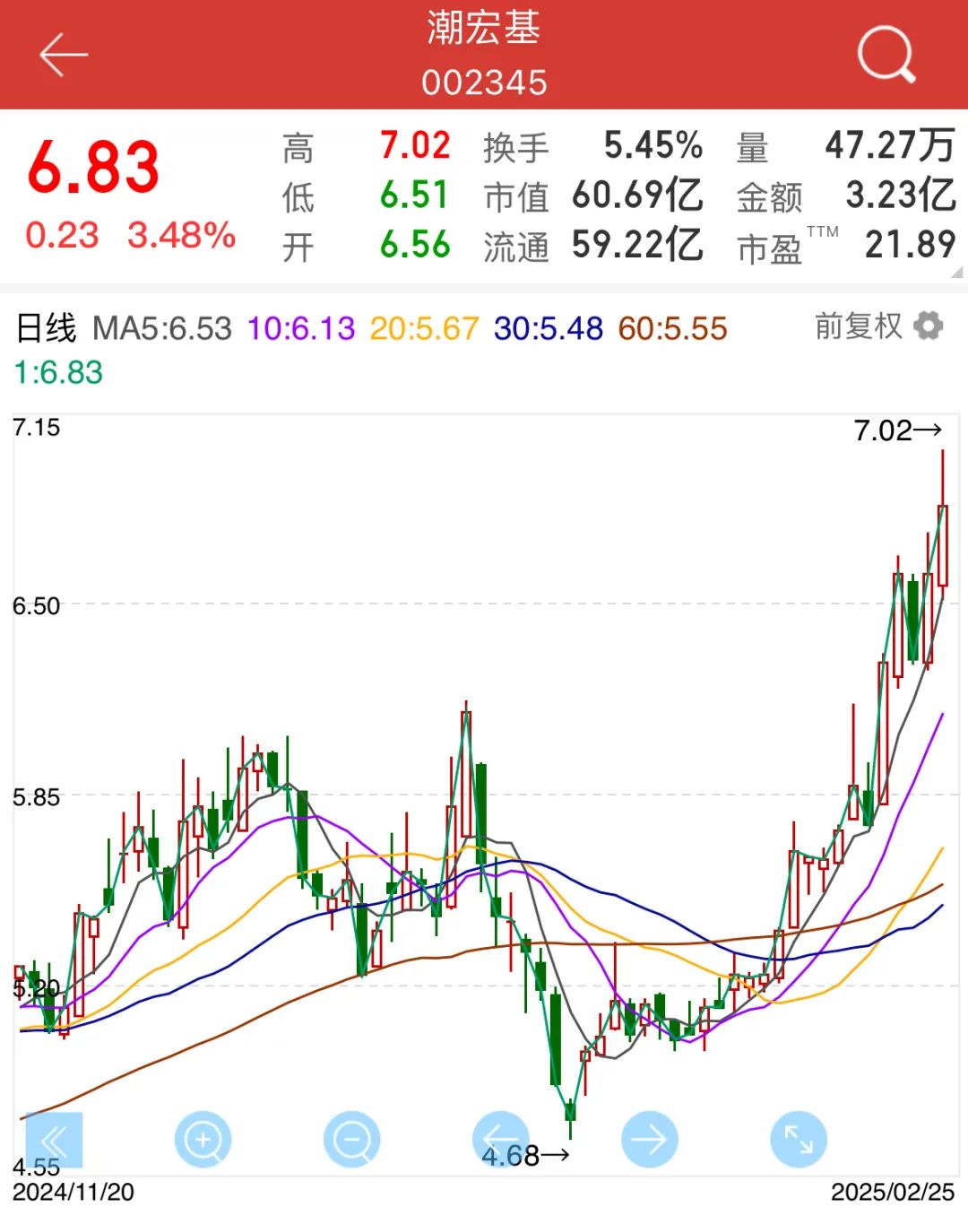 今天A股三大股指集体调整,潮宏基逆势大涨3.48%,收报6.83元/股,创18个月来新高。