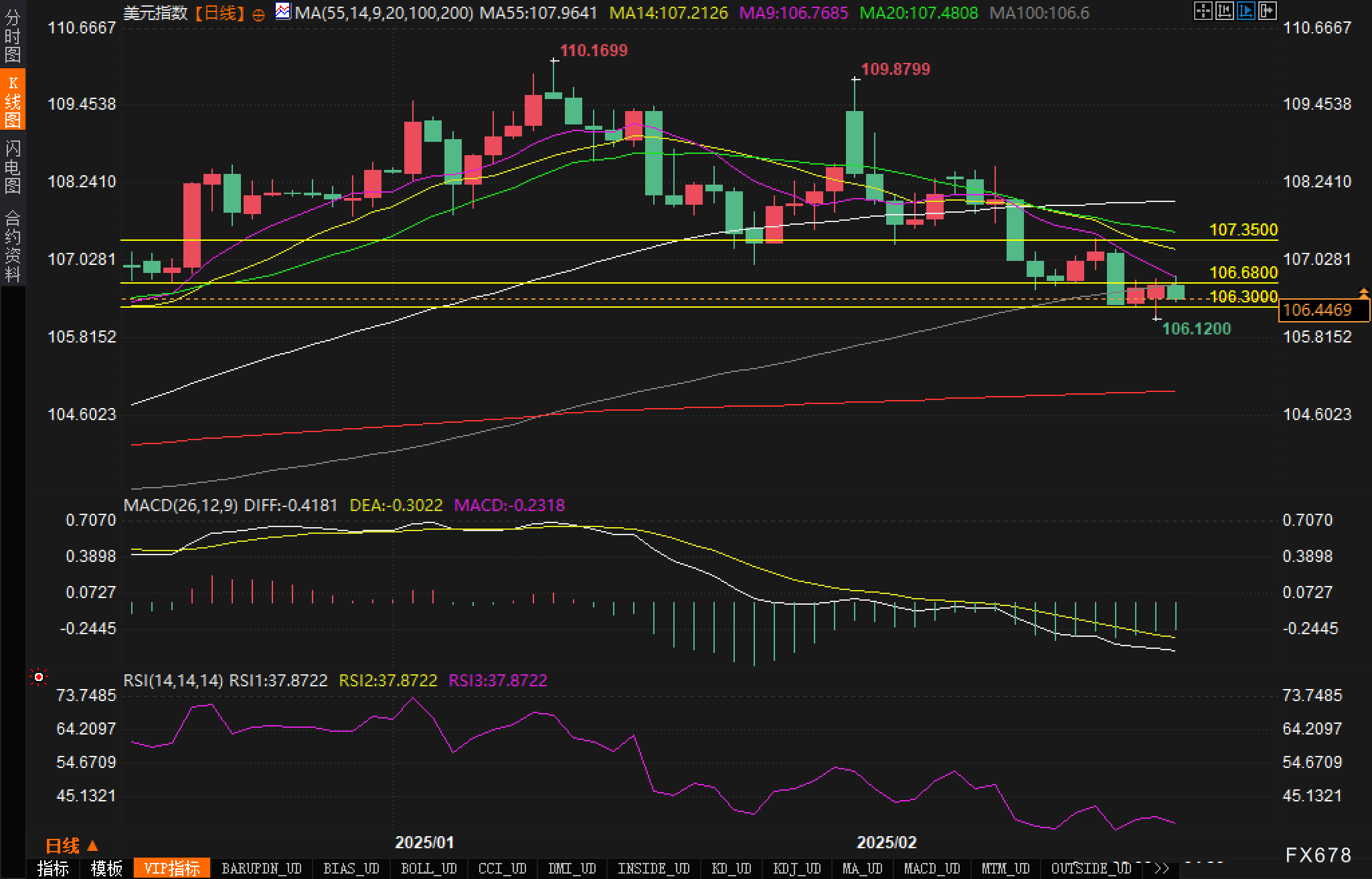 汇通财经APP讯——周二(2月25日)美市盘前,在全球市场动荡的背景下,美元指数(DXY)目前维持在106.40附近。尽管股市、黄金和债券市场都经历了显著波动,但美元指数似乎未能引起市场的太多关注。美元指数的表现相对平淡,市场情绪受到全球经济不确定性以及即将发布的重要经济数据的影响。