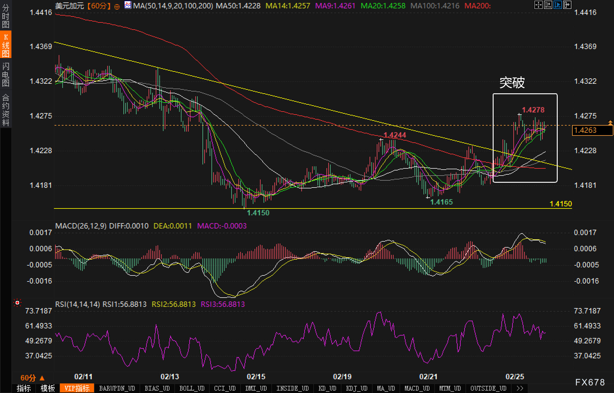 首先,从技术形态上看,美元/加元在小时图上突破了之前形成的下降三角形图形。下降三角形的上边界在2月9日的高点1.4380处,而下边界则在2月14日的低点1.4151处。这一突破暗示了短期内上涨的可能性。