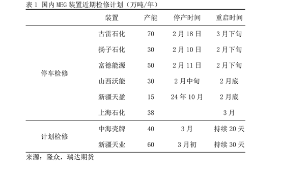 从检修计划来看,2月中旬开始新增检修180万吨/年装置,包括扬子石化意外停车10-20天,以及富德、沃能按计划检修等。3月有100万吨/年装置检修计划,尽管2月底部分装置陆续恢复,但整体乙二醇供应处于下滑通道,预计1-2月乙二醇供应端维持在高位,3月乙二醇供应开始回落。