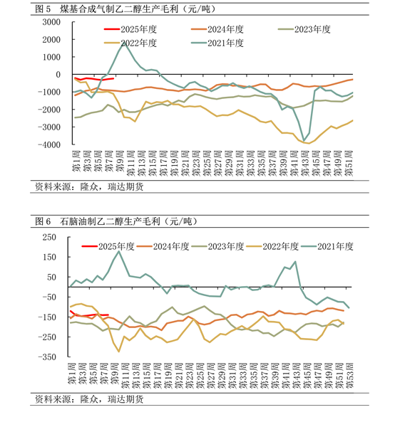 2025年乙二醇新增产能一体化装置为主,多数有下游装置配套,另外天然气制装置为正达凯60万吨装置,计划一季度投产,目前正达凯前道装置试车中,下游配套瓶片装置,以自用为主。截止目前,国内乙二醇装置2860万吨,其中煤制乙二醇装置1050万吨(占比37%),非煤制乙二醇产能1810万吨(包括一体化和MTO,占比约63%)。2025年乙二醇与下游产能新增基本同步,去年阶段性供需错配行情或难再现。