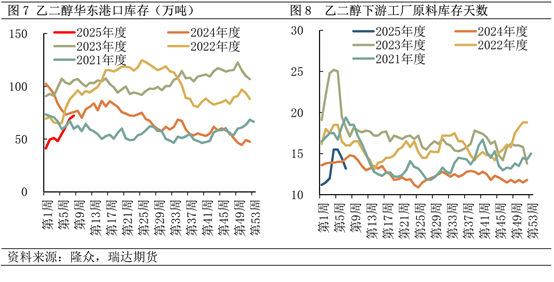 库存方面,作为国内乙二醇生产、下游聚酯工厂提货以及进口货源的中转,华东港口库存能反映乙二醇基本面的边际变化,随着工厂直发货和一体化装置的增加,还需要结合厂家原料库存综合评估乙二醇供需情况,目前工厂原料库存处于历史区间下沿,节后工厂开工回升,但上游成本端支撑偏弱,工厂备货意愿一般。一季度港口季节性累库趋势明显,目前华东乙二醇港口库存仍低于往年同期水平,且随着3-4月海外检修计划增多,后续集中到港情况有所改善。