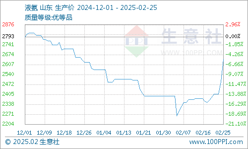 液氨市场经历了此前两个月的持续震荡下行以后,进入2月逐渐筑底企稳,本周以后液氨受供应收紧和需求回暖双重利好驱动,价格大幅上涨。据生意社商品行情分析系统,截止2月25日,本周山东地区液氨涨幅达9.83%。目前山东地区液氨主流价格在2500-2700元/吨。