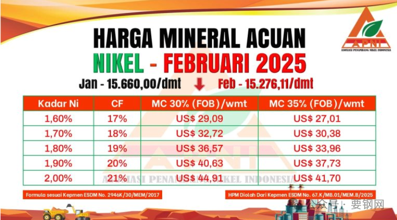 印度尼西亚镍矿工协会发布2月矿物参考价格
