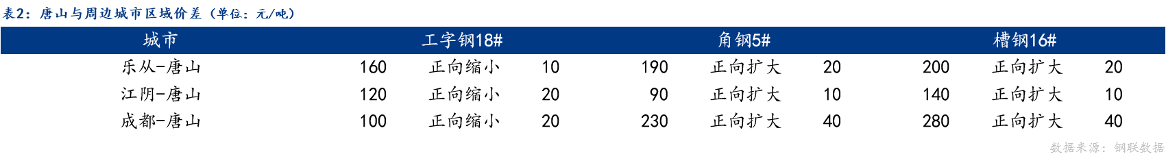 从区域价差来看,今日唐山与乐从、江阴、成都工字钢价差正向缩小,与角钢、槽钢价差正向扩大;
