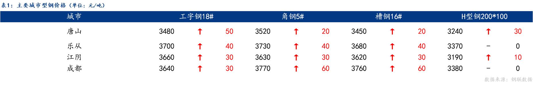 今日型钢价格趋强运行,唐山槽钢、角钢、工字钢、H型钢价格较上一交易日上涨20-30;乐从工字钢、角钢、槽钢价格较上一交易日上涨40元/吨,H型钢价格较上一交易日持稳;江阴工字钢、角钢、槽钢、H型钢较上一交易日上涨10-30元/吨;成都工字钢、角钢、槽钢价格较上一交易日上涨30-60元/吨,H型钢价格较上一交易日持稳。