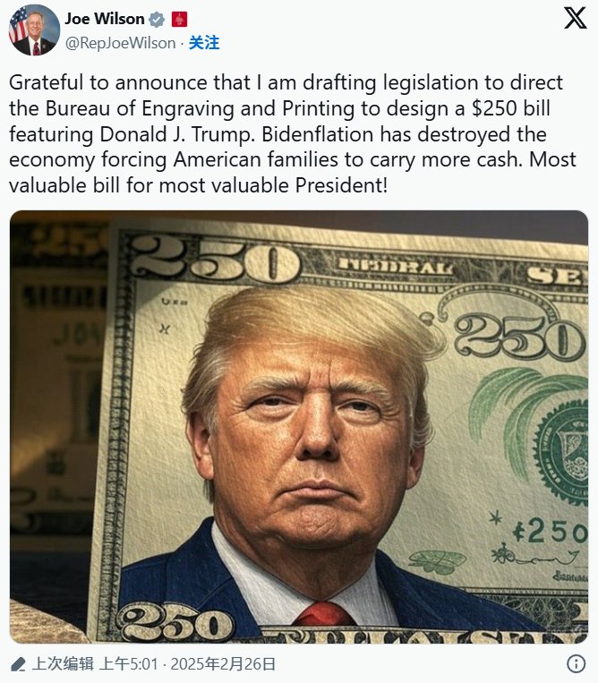 当地时间2月25日,美国共和党国会众议员乔.威尔逊(Joe Wilson)在X网站表示,他正在起草立法,指示美国雕刻和印刷局设计一张印有特朗普头像的250美元钞票。威尔逊称:“很高兴地宣布,我正在起草立法,指示雕刻和印刷局设计一张印有特朗普头像的250美元钞票。拜登的通货膨胀摧毁了经济,迫使美国家庭携带更多现金。最有价值的钞票献给最有价值的总统”