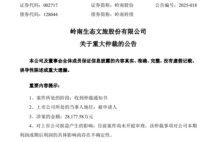 涉案金额超2.8亿元!岭南股份因借款逾期被东莞银行申请仲裁