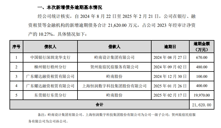具体来看,除了对东莞银行东莞分行新增1.997亿元逾期外,岭南股份本部新增100万元逾期债务,一级子公司岭南设计集团有限公司和上海恒润数字科技集团股份有限公司分别新增670万元和400万元逾期债务,孙公司贺州旅宿民宿服务有限公司新增480万元逾期债务。