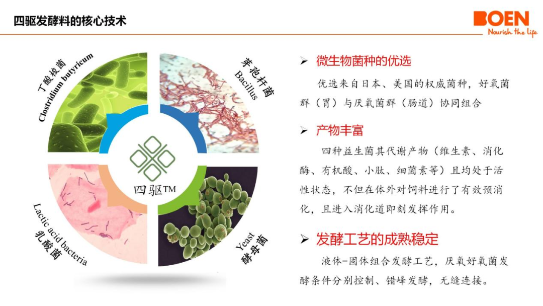 播恩四驱双酸发酵料是一款运用先进生物工程技术研发的新时代产品。它精选芽孢杆菌、酵母菌、乳酸杆菌和丁酸梭菌四株优质菌种,采用厌氧和好氧相结合的发酵工艺,经14天以上深度发酵,产生大量有益菌及其代谢产物。这种独特的菌种组合和发酵工艺,赋予了四驱双酸发酵料多重优势: