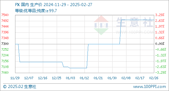 2月27日,生意社PX基准价为7500.00元/吨,与本月初(7300.00元/吨)相比,上涨了2.74%。