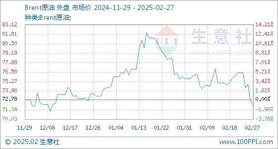 2月27日生意社Brent原油基准价为72.50美元/桶