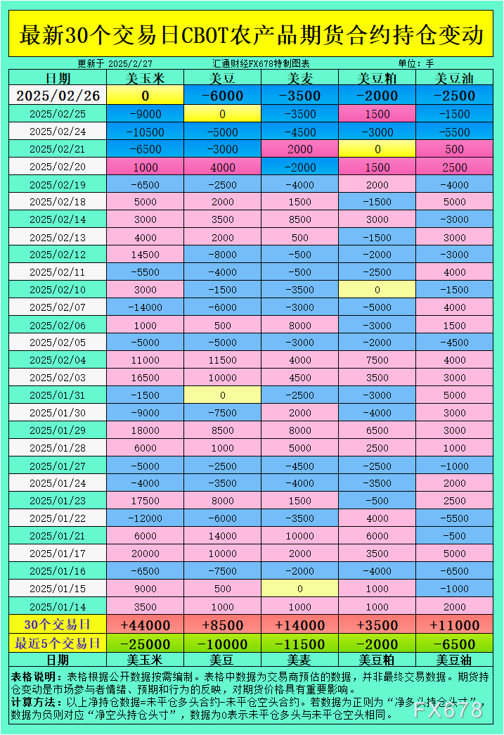 从基金持仓来看,大豆近期的净空头持仓较为明显,显示出市场对大豆未来走势的担忧。根据持仓数据,大豆在过去一周的净持仓减少了约10,000手,进一步表明市场情绪趋于谨慎。短期内,随着南美的收获压力持续增加,美国大豆的出口需求可能会受到抑制,进而影响价格走势。