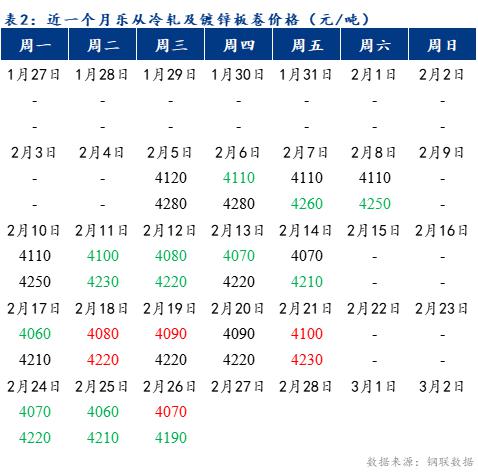 截止2025年2月26日17:30,冷轧板卷月均价为4092元/吨,镀锌板卷月均价为4236元/吨。
