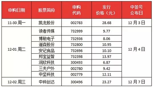 即将申购的10家新股公司分别在11月30日申购1只,12月1日申购8只,12月2日申购1只。申购新股仍按照旧规发行,需要预先缴纳申购款,待申购完成后未中签款项全额退还。由于市场在近半年有较大跌幅,行业市盈率有不同程度的跌幅,而市场情绪趋向保守,本次新股上市后涨幅预计将会低于上半年表现,打新回报率自然下降。