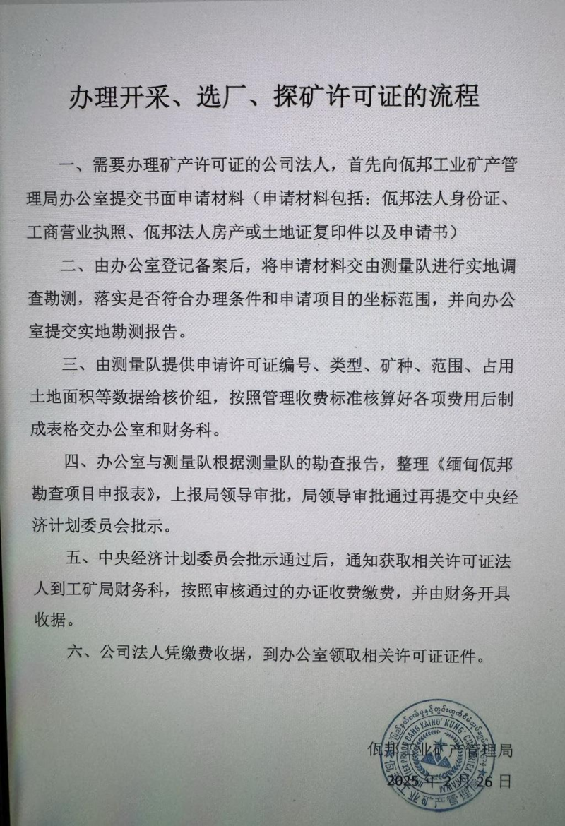 佤邦工业矿产管理局发布《办理开采、选厂、探矿许可证的流程》
