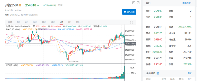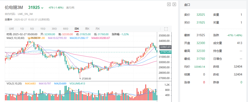 佤邦工业矿产管理局2月26日发布了《办理开采、选厂、探矿许可证的流程》。市场参与者多数把这一流程公告解读为佤邦曼相矿区锡矿即将复产的信号,而市场对佤邦复产预期的升温,击落了锡价。继夜盘出现下跌之后,27日伦沪锡延续弱势,截至2月27日15:03分,沪锡报254010元/吨,跌3.69%;伦锡报31925美元/吨,跌1.48%。