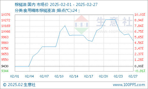 据生意社商品行情分析系统显示:2月国内棕榈油行情振荡上涨为主,整体接近5%。2月1日,棕榈油市场均价9430元/吨,2月27日,棕榈油市场均价9900元/吨,上涨4.98%。
