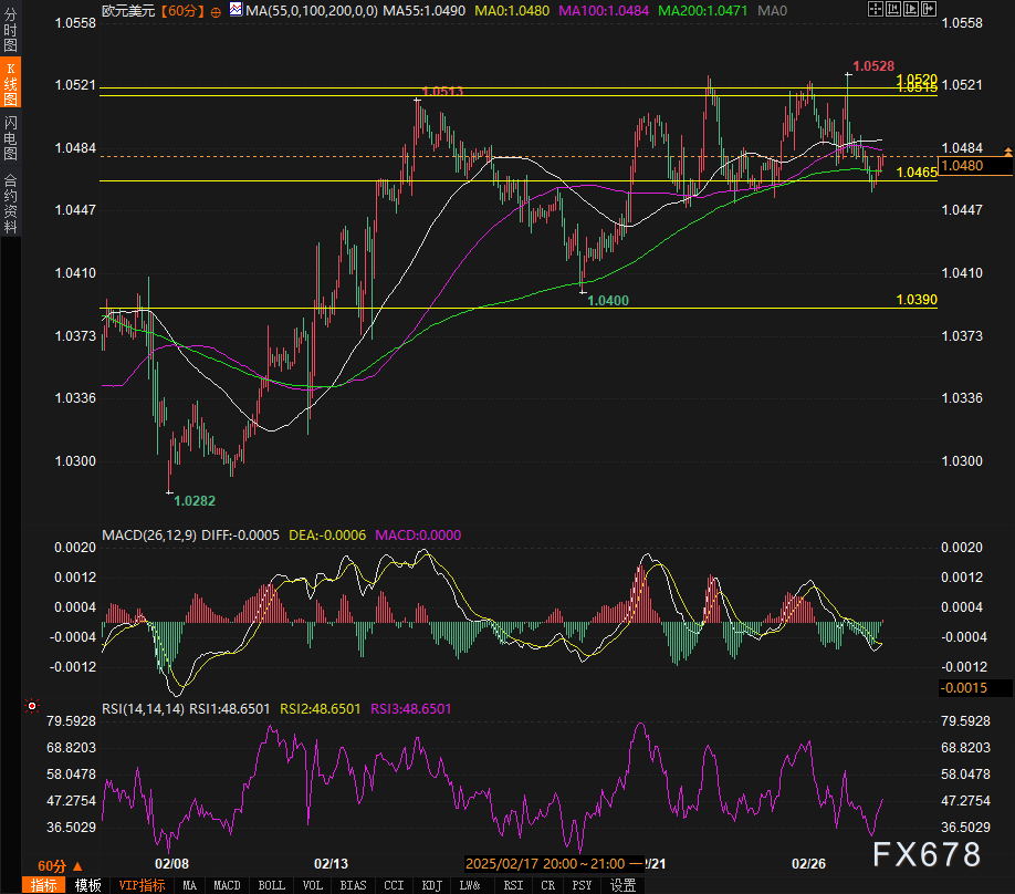 汇通财经APP讯——周四(2月27日),近期,欧元/美元(EUR/USD)依旧维持在一个相对狭窄的区间内震荡整理,日内价格在1.0458到1.0492区间波动。尽管全球地缘政治形势存在诸多不确定性,但EUR/USD的波动未能脱离短期利差的影响,仍然在相对稳定的范围内运行。