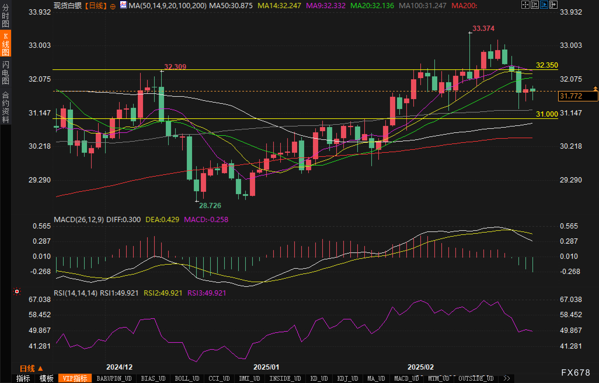 综上所述,白银的市场表现受美元走势、全球经济前景及工业需求的共同影响。从技术面分析来看,白银突破32.35美元后可能会经历震荡整理,但整体上涨趋势仍未改变。关注31.00美元支撑位的变化,以及33.33美元阻力位的突破情况。如果白银能够突破33.33美元,则可能打开更大的上涨空间。