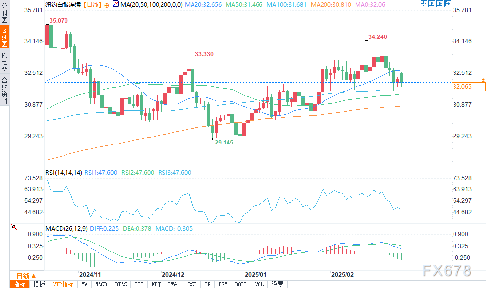 3月白银期货多头在整体短期技术面略有优势,但日线图上的价格上升趋势已被打破。白银多头的下一个上行价格目标是收盘价高于33.60美元这一强劲技术阻力位。空头的下一个下行价格目标是收盘价低于31.00美元这一强劲支撑位。第一阻力位在周三的高点32.61美元,然后是33.00美元。下一个支撑位在隔夜低点32.155美元,然后是本周低点31.895美元。