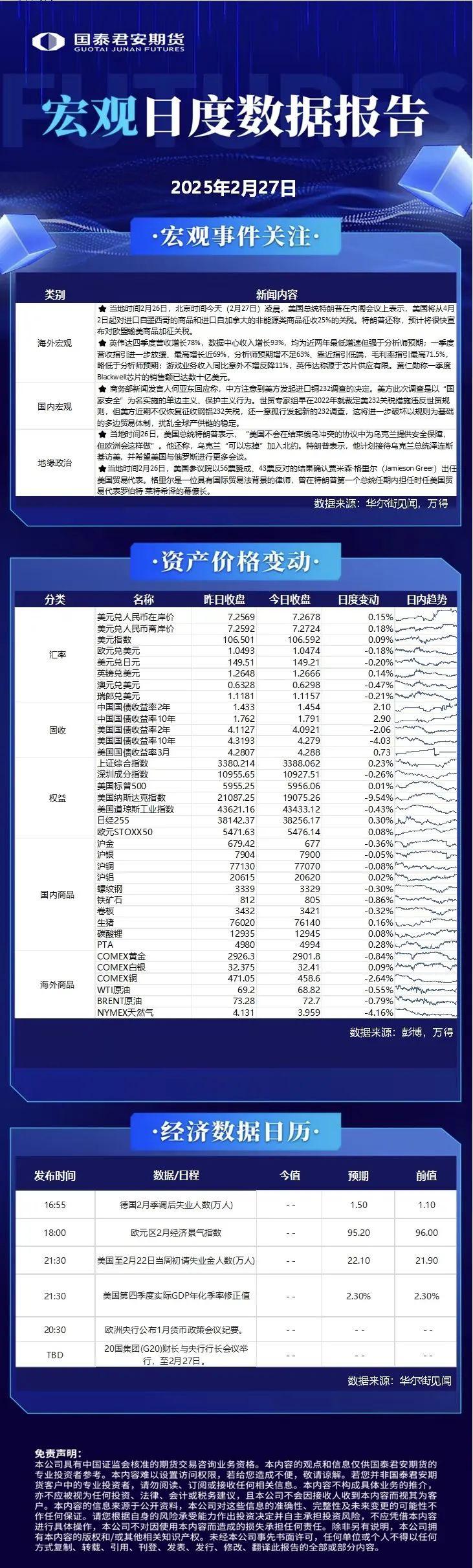 观点分享:周四,美国经济分析局公布数据显示,美国四季度实际GDP年化季环比修正值2.3%,与初值持平。虽然增速较前几个季度有所放缓,但仍显示出韧性。令人忧虑的是通胀数据,美联储首选的通胀指标——剔除食品和能源的核心个人消费支出(PCE)价格指数——在第四季度年化增长率为2.7%,高于最初报告的2.5%。这可能增强美联储官员对未来降息的谨慎态度。