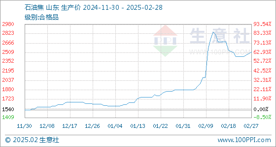 2月28日,生意社石油焦基准价为2512.50元/吨,与本月初(1877.50元/吨)相比,上涨了33.82%。