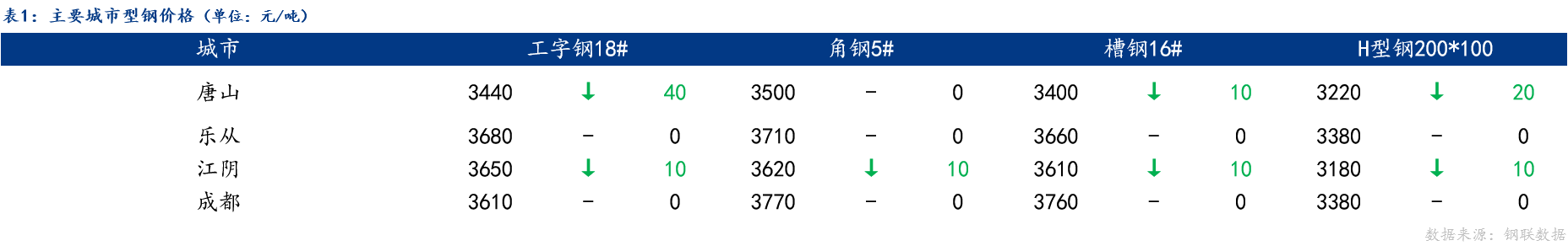 今日型钢价格趋弱运行,唐山槽钢、工字钢、H型钢价格较上一交易日下跌10-40元/吨,角钢价格较上一交易日持稳;乐从工字钢、角钢、槽钢、H型钢价格较上一交易日持稳;江阴工字钢、角钢、槽钢、H型钢较上一交易日下跌10元/吨;成都工字钢、角钢、槽钢、H型钢价格较上一交易日持稳。