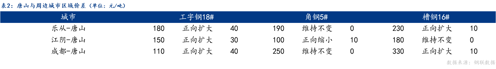 从区域价差来看,今日唐山与乐从、成都工字钢、槽钢价差正向扩大,与角钢价差维持不变;与江阴工字钢价差正向扩大,与角钢价差正向缩小,与槽钢价差维持不变;