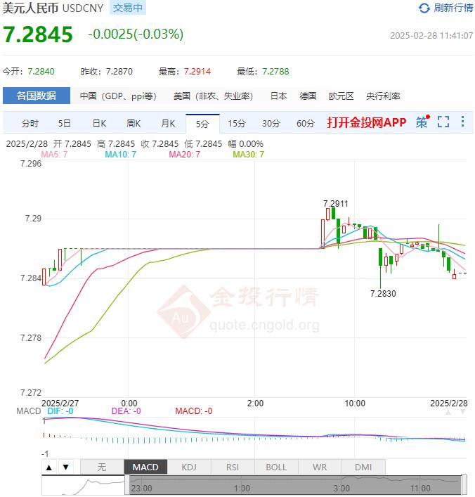 截至发稿,美元兑换人民币汇率报价7.2845,跌幅0.03%,最高价7.2914,最低价7.2788,今日美元/人民币汇率开盘价7.2840。
